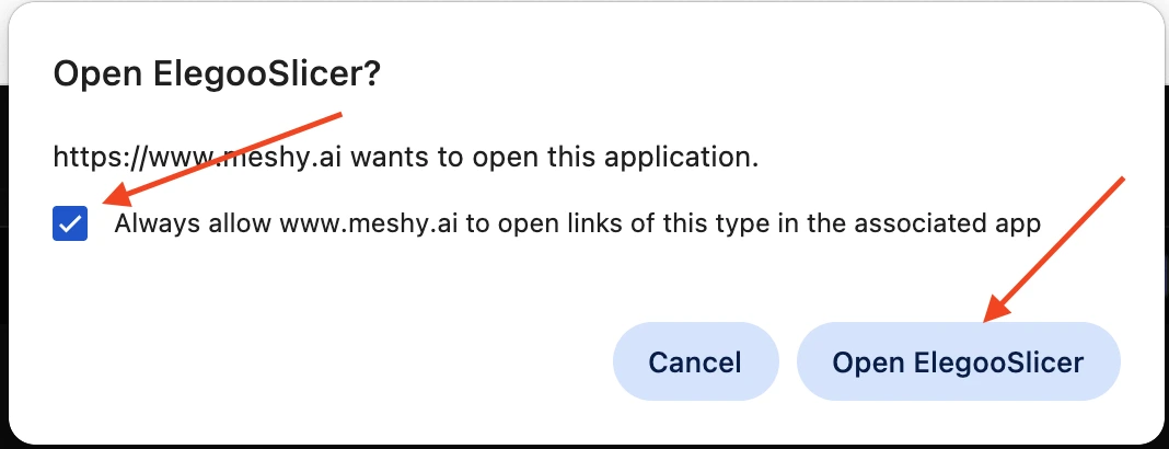 After a short loading period, a prompt window will pop up asking you to check Always allow www.meshy.ai to open links of this type in the associated app, and then click the Open Elegoo Slicer button.