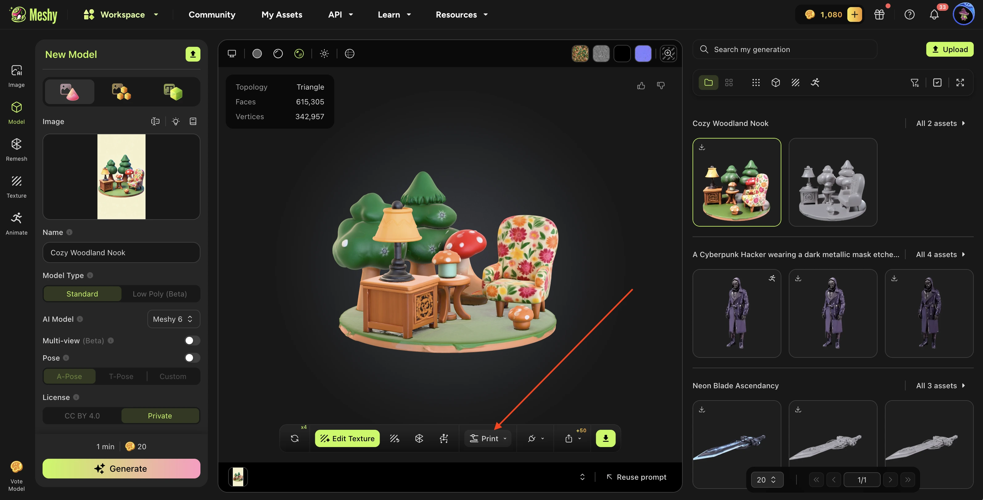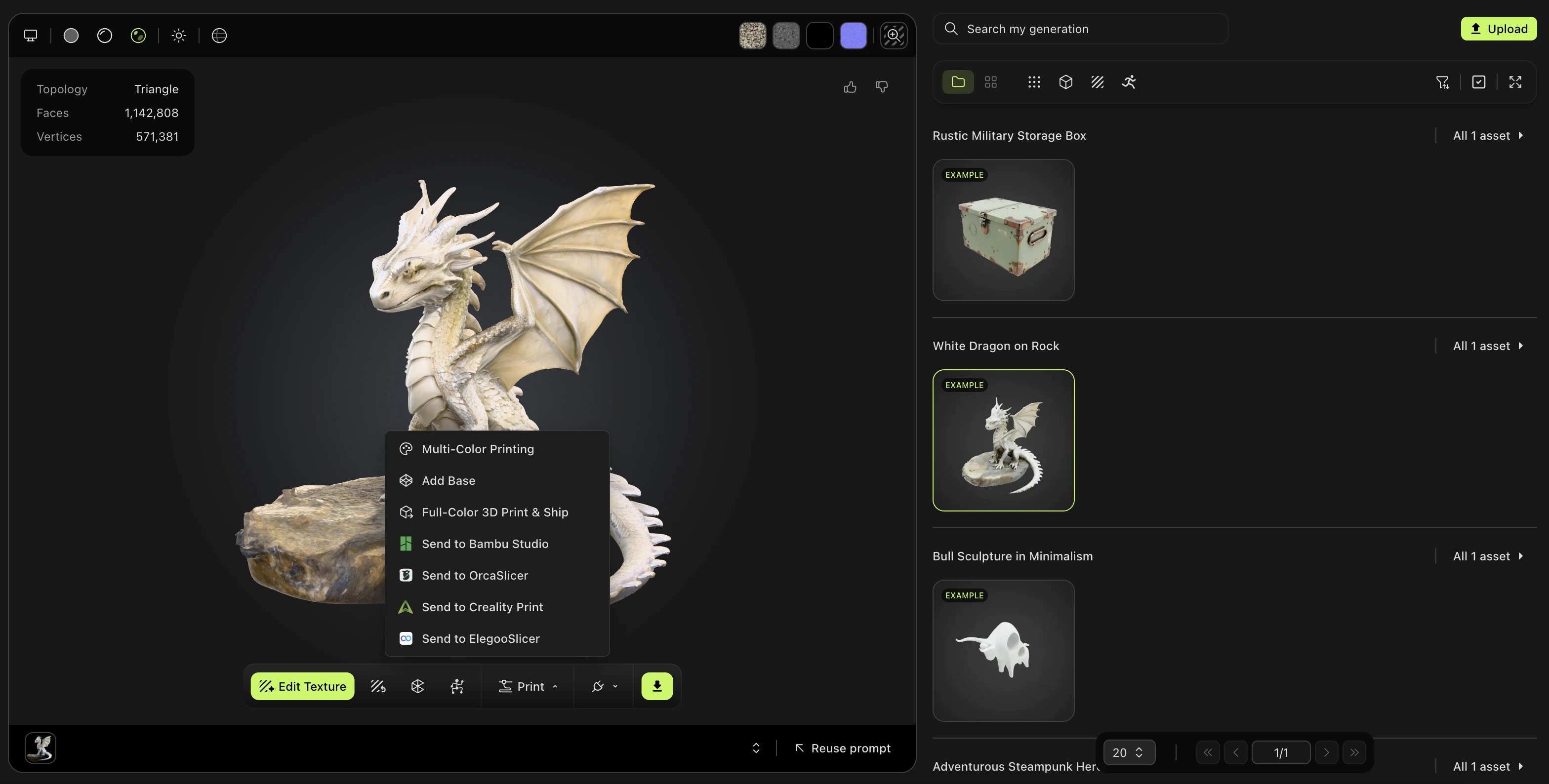 Navigate to the model you want in your MeshyAI workspace, click the Print menu, and select Send to Elegoo Slicer.