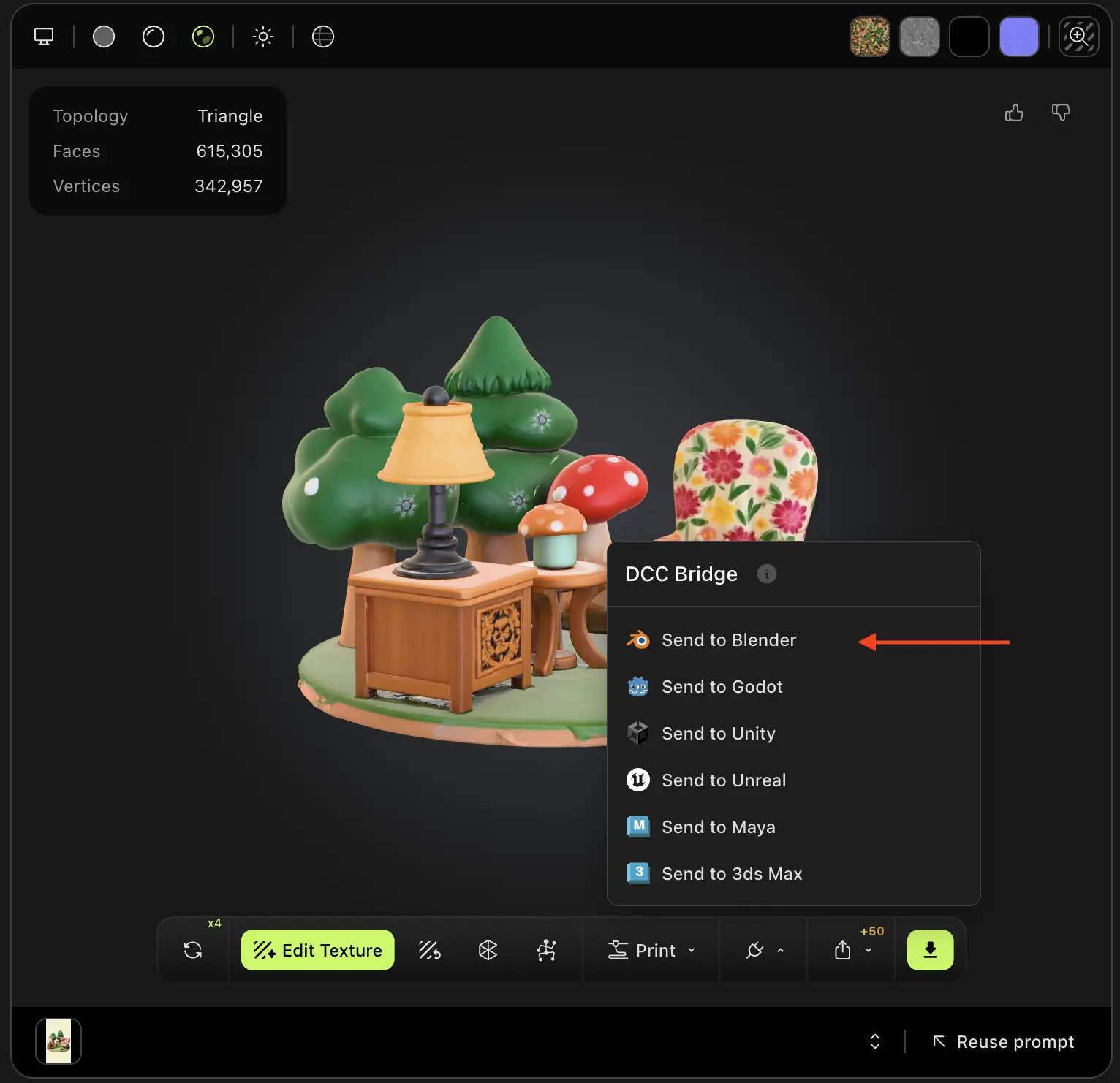 Any 3D model you generate in your workspace—regardless of the method used—can be effortlessly imported into Blender via the DCC Bridge.